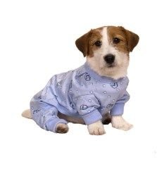 The Sweet Dreams K-9 PJ's are soft and cozy and will keep your best friend warm at night. The PJ's have four knit leg sleeves and a Peter Pan collar. The blue PJ's have a pattern of sleeping puppies floating in a dream world of dog bones and paw prints.They are made of a polycotton blend. They can be machine washed in cold water and tumble dry on low heat.The Sweet Dreams PJ's fit dogs 14"-16" such as: Beagle, Fox Terrier, Mini Schnauzer, Pug, Manchester Terrier.How to measure your dog: Measure your dog from the base of the neck to the base of the tail.