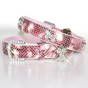 These upscale designer dog collars are made with quality in mind. They are gorgeously done in elegant pink with Swarovski crystal inserted bone-shape charms added to the beautiful python pattern leather for the pampered pet! Designed with a Timeless Color Palette - won't be found on the "What's Not" list next season