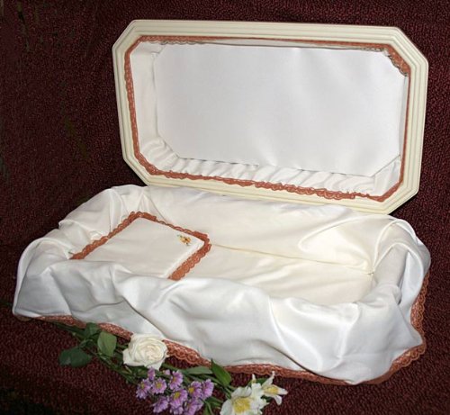 Deluxe pet casket with lace-trimmed crepe interior and almond finish exterior. Dimensions: 32" x 16" x 11".