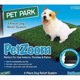 The PetZoom Pet Park is the unique solution for pet accident-free living. Perfect for when you're late coming home to let the dog out, or unable to let your pet outside due to bad weather. Ideal as a training tool for your puppy, it's also great in assisting an older dog that might be unable to go to the bathroom outside. Pet Park is made of a synthetic grass material that looks and feels real. It is weather proof, so you can leave it outside on the patio or balcony. PetZoom Pet Park is non-toxic and is safe to use around your pet. Easy to clean, just wash in warm soapy water. Pet Zoom Pet Park is an indoor pet potty made of a synthetic surface that's similar to grass. It prevents pet accidents by giving your dog a designated place to urinate instead of using your carpet or furniture. Pet Park's triple stage protection allows fluid to pass through the anti-microbial mat. The mat stays high above the liquid in the collection tray because of Pet Park's elevated grid system. It can hold an entire gallon of liquid. Simply empty the collection tray at the end of the day. Pet Park's reusable surface stays fresh and sanitary. It rinses clean and stores easily. Now, you don't have to spend lots of money on expensive dog walkers or messy wee wee pads. With Pet Park, you'll be happy your dog went in the house.