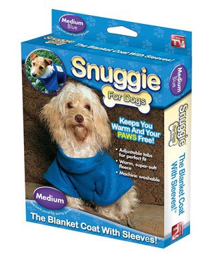 Snuggie for Dogs in Blue - As Seen on TVDog Snuggies! Finally you can keep your dog warm all year long. It's the blanket coat with sleeves. No more struggling with trying to dress your squirmy pet in tight apparel. The Snuggie for dogs has adjustable velcro tabs and an easy step into design that makes dressing effortless. Roomy sleeve design for ease of movement. The Dog Snuggie is so comfortable your dog won't even know he has it on. It can easily be worn with collars and harnesses without interfering. Perfect for long walks, playing in the yard, traveling and more! Now your pet can have the same comfort and warmth as you do all year round with our Snuggie for dogs. An absolute must have for fall and winter the Snuggie blanket is also machine washable. The Snuggie blanket will provide warmth all winter long.Recommended Breed Sizing:X-Small: Teacup breedsSmall: Bichon Frise, Chihuahua, Dachshund - miniature, Maltese, Pekingese, Pinscher - miniature, Toy Poodle, Yorkshire Terrier - miniature.Medium: Beagle, Boston Terrier, Cavalier King Charles Spaniel, Cocker Spaniel, Dachshund - standard, Jack Russell Terrier, Poodle - miniature, Pug, Schnauzer - miniature, West Highland Terrier.Large: Bull Terrier, Chow Chow, Collie, Corgi, Dalmation, Doberman, English Bulldog, Labrador Retriever, Wheaten Terrier.Fit Tips:Length: Measure from the base of dog's neck to the beginning of tail.For pudgy, furry and deeper-chested dogs we recommend going one size larger.