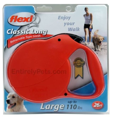 Flexi Long 3 Retractable Tape Leash is the world's longest retractable cord leash for walking your dog. It extends up to 26 feet and is for small dogs up to 110 lbs.Directions: 1. Extend your arm forward and press the brake button with your thumb to prevent the dog from further extending the leash cord. 2. With the brake button depressed, step towards your dog and at the same time bring your arm to your side. 3. Release the brake button and swing your arm towards the dog so that the leash cord can retract into the leash housing. Press the brake button again to prevent the leash cord from extending further. Repeat this procedure as often as needed.Warning: To avoid potential eye and face injury and cutting, burning and amputation injuries to your body from the leash cord and hook, all users must read and follow the enclosed Warnings and Directions for Use pamphlet before using the Flexi Dog Leash. For use by responsible adults only. NEVER use the leash near or around infants and children. NEVER WRAP THE LEASH CORD AROUND FINGERS OR OTHER BODY PARTS!