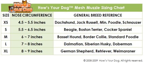 This comfortable, lightweight, durable and easily adjustable muzzle is constructed of a breathable mesh material with a quick snap closure to make muzzling easier. A muzzle is a safe and humane way to handle dogs that are aggressive or injured. It prevents biting, chewing, and barking without catching hair or causing pain. It features a soft, padded nose band and still allows your pet pant and drink. Hand wash. Comes in a range of sizes for a good fit. This mesh muzzle is designed for temporary restraint only. Remember not to use the muzzle on your dog for longer than 20 minutes at a time. Don't leave a muzzled dog unattended. Prolonged use or improperly fitted muzzles can affect a dog's panting, or natural ability to cool itself. *** This listing is for the style, color and size in the listing title. ***To determine the proper size muzzle for your dog, please measure nose circumference, in inches, and click on the "View larger images and other views" above for the instructions and sizing chart to find the correct size.***